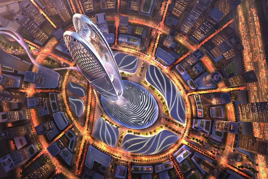 The tower’s base, which is shaped like Sheikh Mohammed’s fingerprint, can hold a variety of social, cultural, and artistic activities and events. A sloped open amphitheater flanked by stores and restaurants is also included, as well as water fountains.