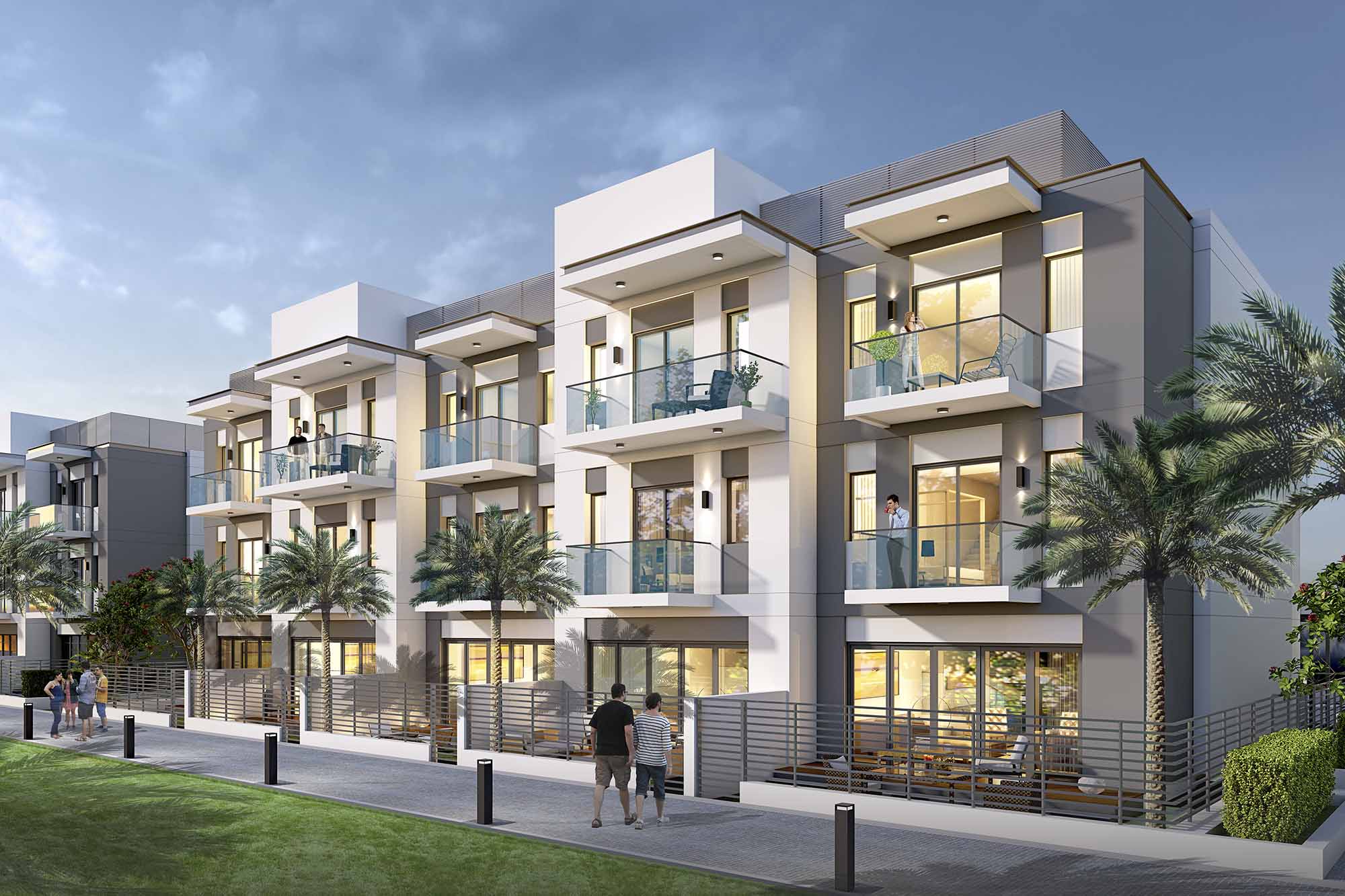 These townhouses generally range between 2,800 to 4,000 sq. ft., offering generous layouts across multiple levels. Interiors typically include three en-suite bedrooms, open-plan living and dining areas, fully fitted kitchens, maid’s rooms, private terraces or gardens, and often a two-car garage. The modern architectural style emphasizes natural light, functionality, and elegance — making these homes attractive to both end-users and luxury renters.