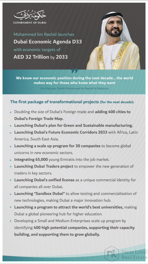 His Highness Sheikh Mohammed bin Rashid Al Maktoum, Vice President and Prime Minister of the UAE and the ruler of Dubai, declared that Dubai had embraced “D33,” the Emirate’s new economic agenda for the next ten years. Dubai’s D33 plan calls for doubling its economy over the next ten years and positioning it one of the top three global financial centres.